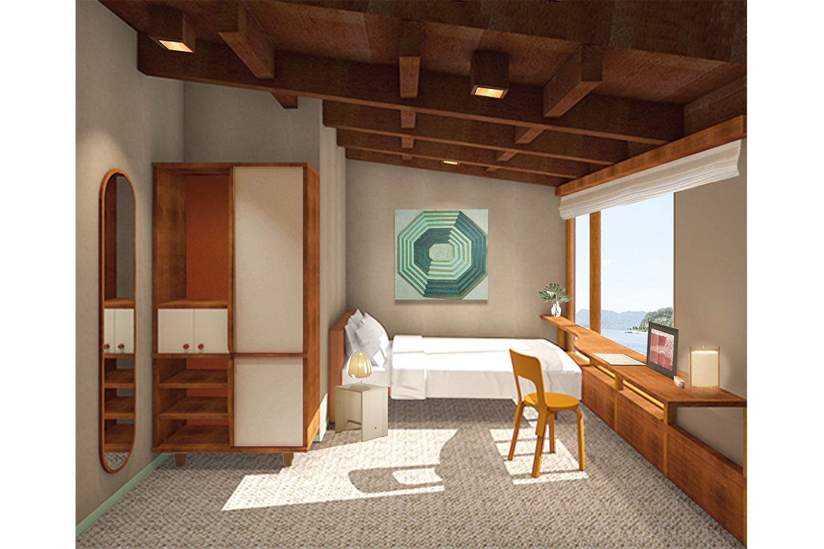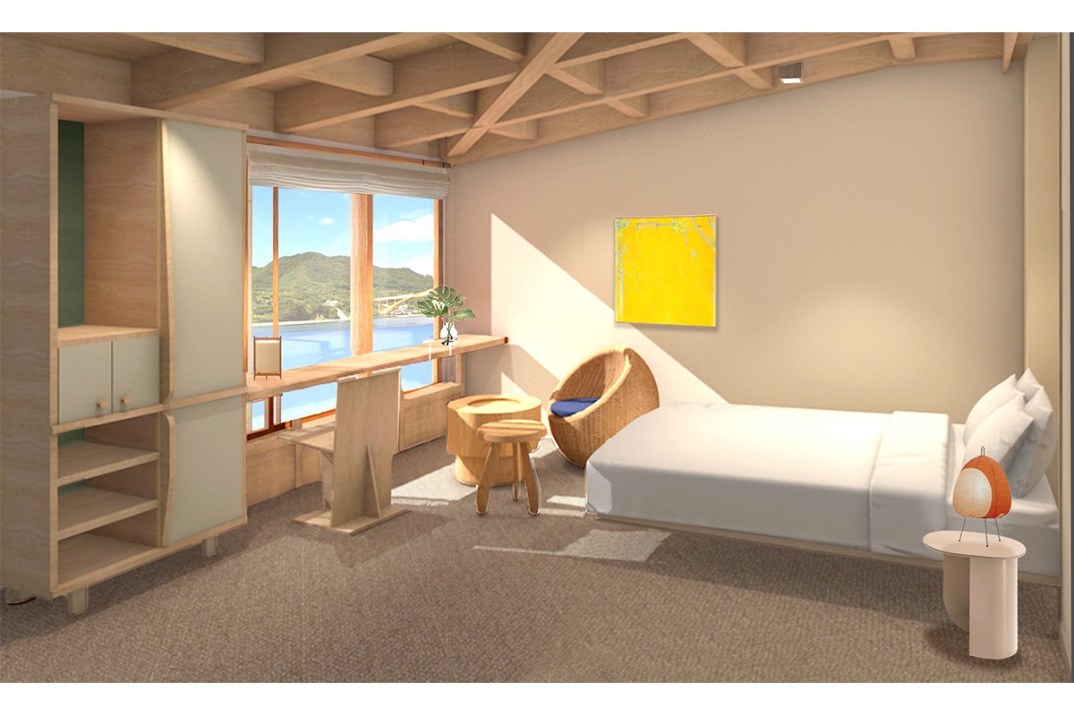 2階に位置するゲストルームには心地よい日差しと潮風が入り込み、瀬戸内の凪を眺めながらゆっくりと過ごすことができる。ワークデスクやクローゼットを備えるプライベートルームが4室あり、それぞれの生活・仕事・旅のスタイルに合わせて気軽な滞在から中長期滞在まで対応可能な機能を備えています。また、サイクリスト等が気軽に宿泊できるようシングルユースにも対応していく予定。
