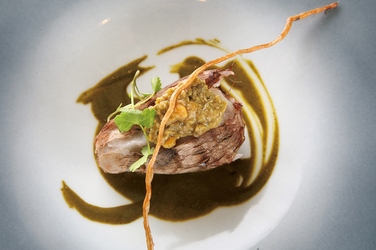 いわき市の伝統野菜に認定されている里芋・長兵衛。軟らかくて皮も食べられる特徴を生かして、堂々と丸ごと使用。下のソースはサンマの肝を使い、上には塩漬けにした身をのせ、サンマでサンド。畑と海のマリアージュだ。