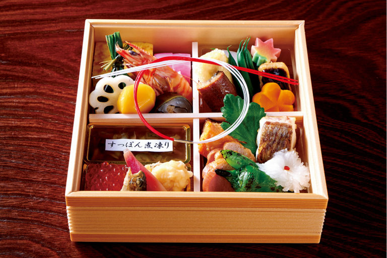 宇治のお茶文化とともに育まれてきた朝日焼、その陶器の大皿を使ってなんとも斬新な松花堂弁当を生み出した。見事に十字を切った刷毛目を模様として、本来松花堂のうつわにある区切りを表したという。大胆かつモダンにも映るうつわの空間をも料理の妙味とし、八寸、お造り、炊き合わせ、ご飯が、お茶の心のおもてなしさながらに盛りつけられる。茶問屋を起源として受け継がれた精神が、いまに生きる不易流行な逸品を生み出した。