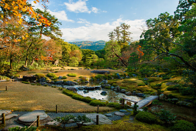 現在の庭園は枯山水庭(かれさんすいてい)、苔庭(こけにわ)、坪庭(つぼにわ)、池庭(いけにわ)、白砂青松庭(はくさせいしょうてい)、亀鶴(きかく)の滝などで構成され、借景の山々を含めると、総面積が約16万5000平方メートル(約5万坪)に及ぶ。各庭園は四季折々に多彩な表情を見せるが、中でも木々が紅葉する秋は最も華やかになる季節。