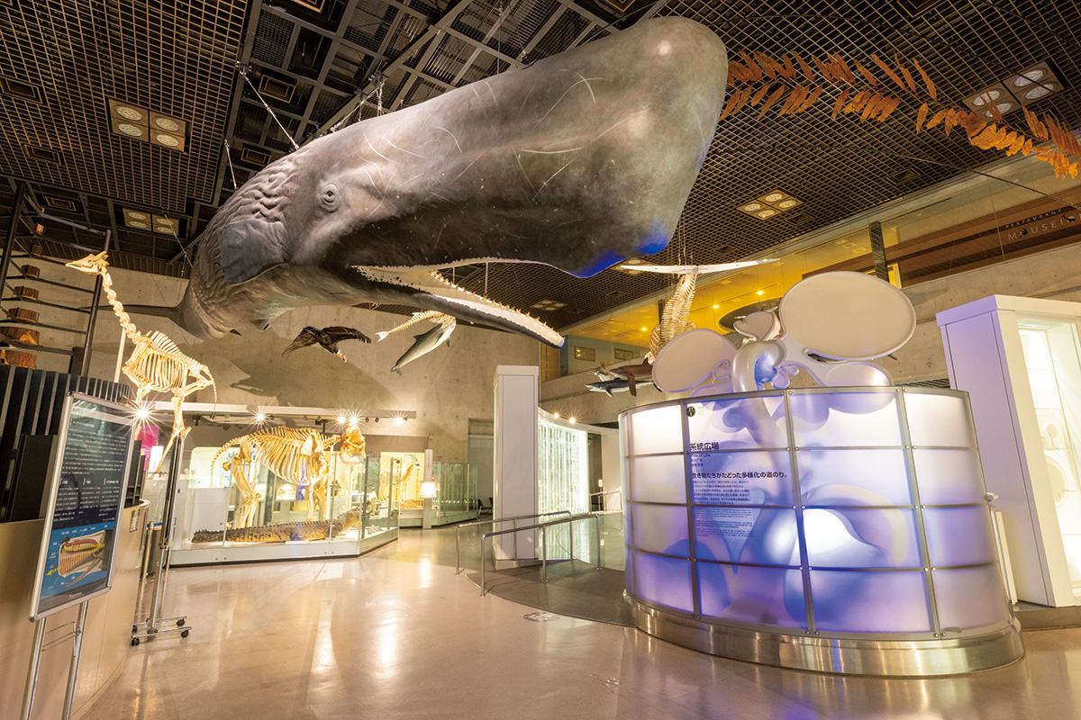 中央には恐竜の標本としては日本ではじめて全身骨格展示されたアロサウルスが鎮座。まるで138億年続く宇宙と46億年前に誕生した地球の歴史を、静かに見守っているようである。展示室の奥へ進むと、巨大なマッコウクジラ半身模型付全身骨格標本の姿が。これは半身模型と実物骨格を組み合わせた世界初の標本で、肛門、へそ、眼、耳を再現するなど、リアルなマッコウクジラを学べる工夫が施されている。